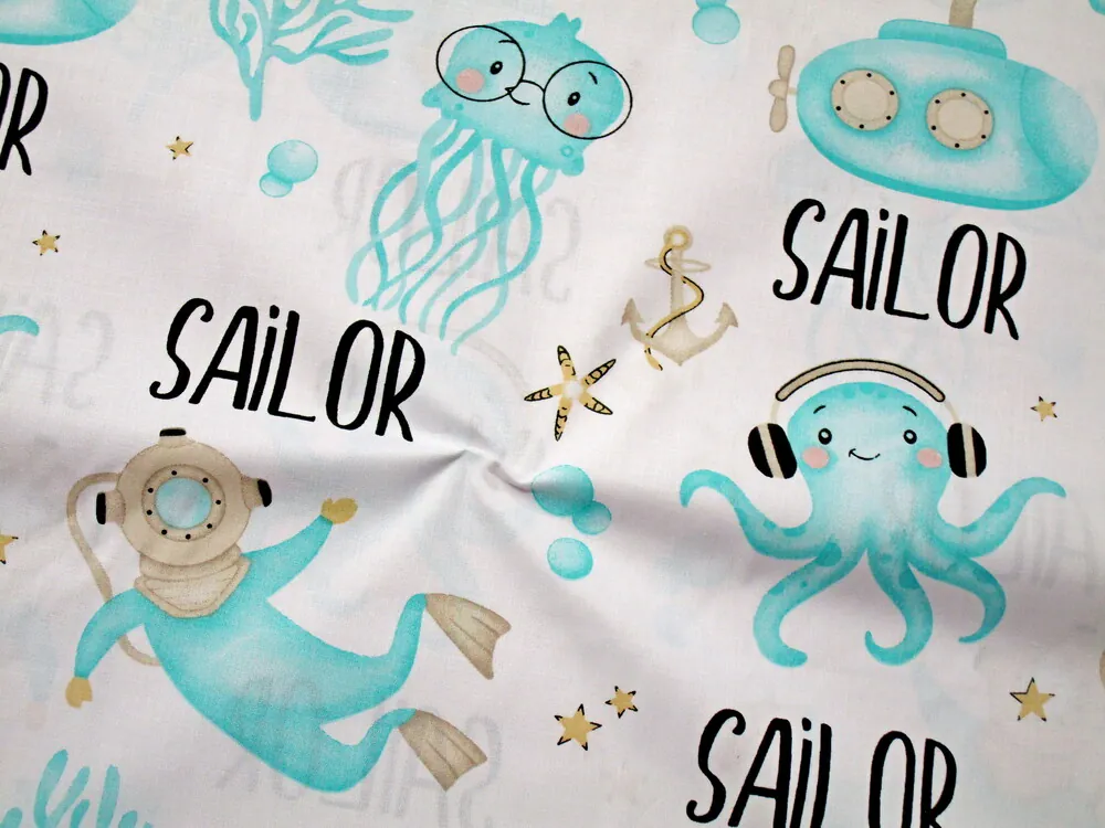 - vzor - tyrkysový potápáč, tyrkysová ponorka, chobotnica, čierny nápis "SAILOR", béžová kotva, béžová hviezda