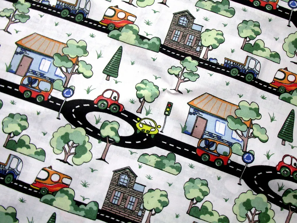 Bavlna biela "autá, domy, stromy, cesta"Skladom5,50 EUR/ m4,47 EUR bez DPH