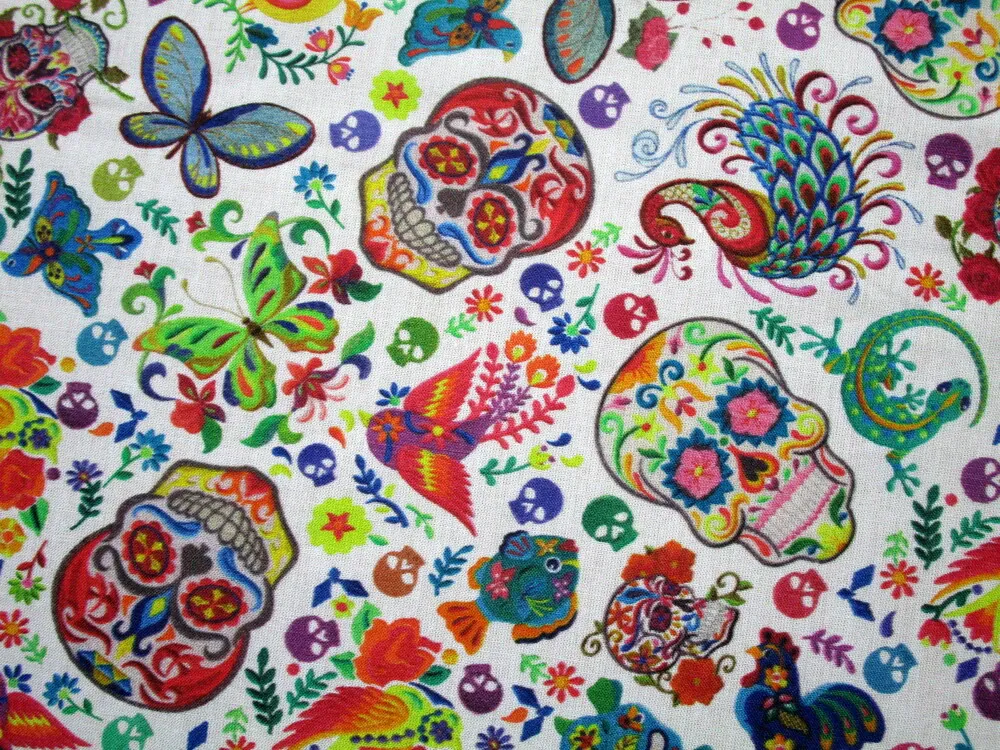 Bavlna biela "lebka, motýľ, vtáčik" - ŠpanielskoSkladom7,00 EUR/ m5,69 EUR bez DPH