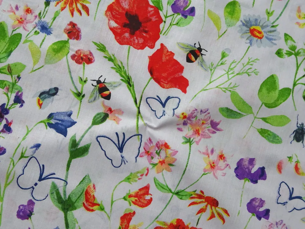 - vzor - červené maky, bielo-červené kvety, fialové kvety, modrý motýľ, chrobáky