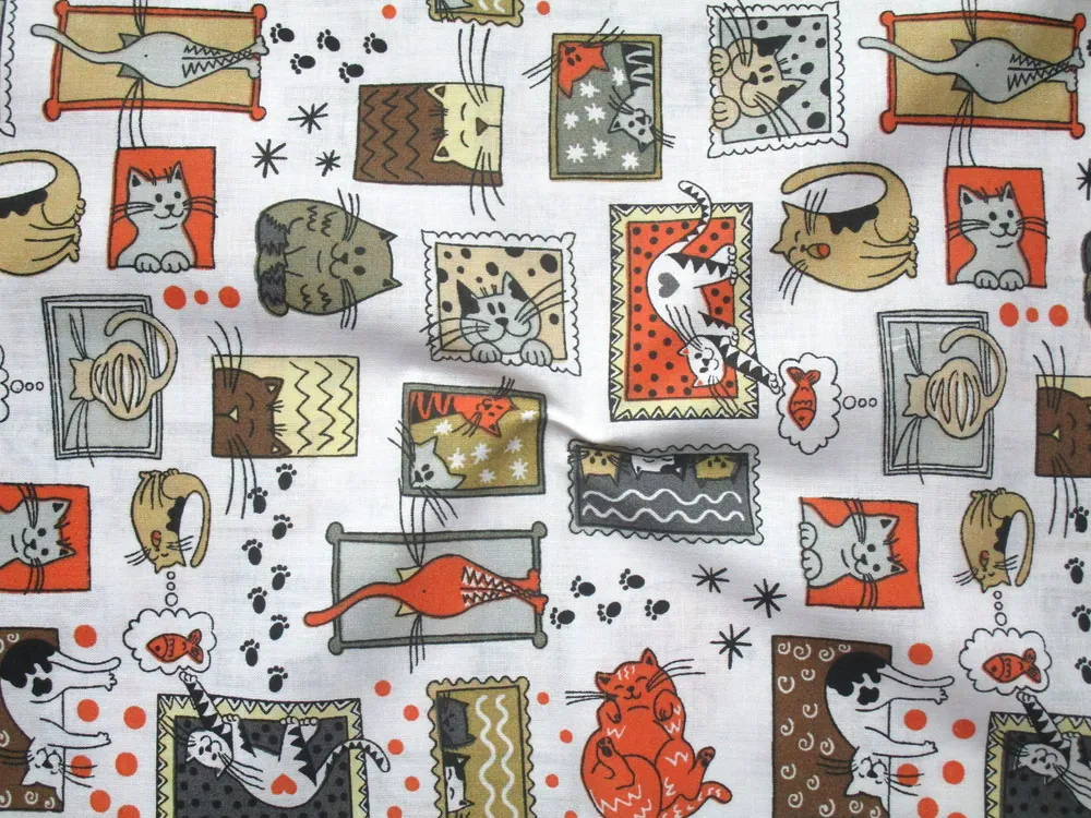- vzor - sivé, béžové, biele a pomarančové mačičky v rámčekoch