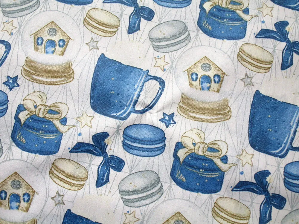 - vzor - bielo - béžové, bielo - sivé a modré makrónky, mašličky, modrá šálka, atď.
