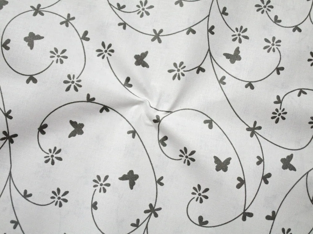 Bavlna biela "sivý motýľ, srdiečko, špirála"Skladom5,50 EUR/ m4,47 EUR bez DPH