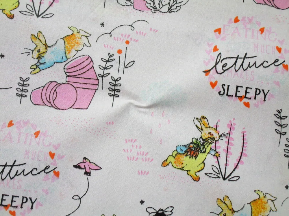 - vzor - zajko v modrom kabátiku, ružový črepník, nápis "EATING TOO MUCH LETTUCE MAKES ... SLEEPY"