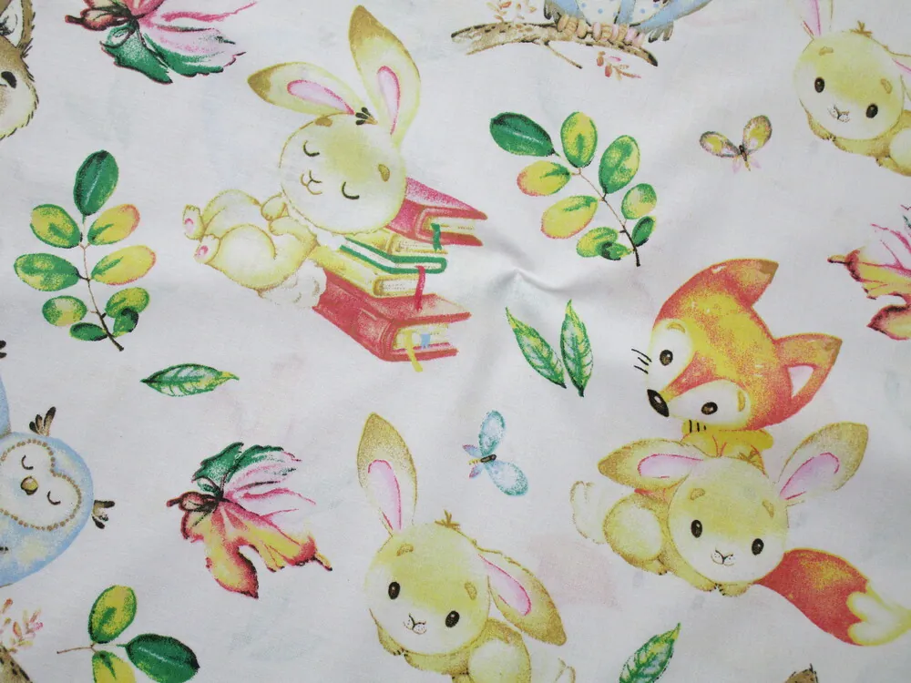 - vzor - sovičky, zajko, líska a ďalšie zvieratká, bielo-žlto-ružovo-zelené listy
