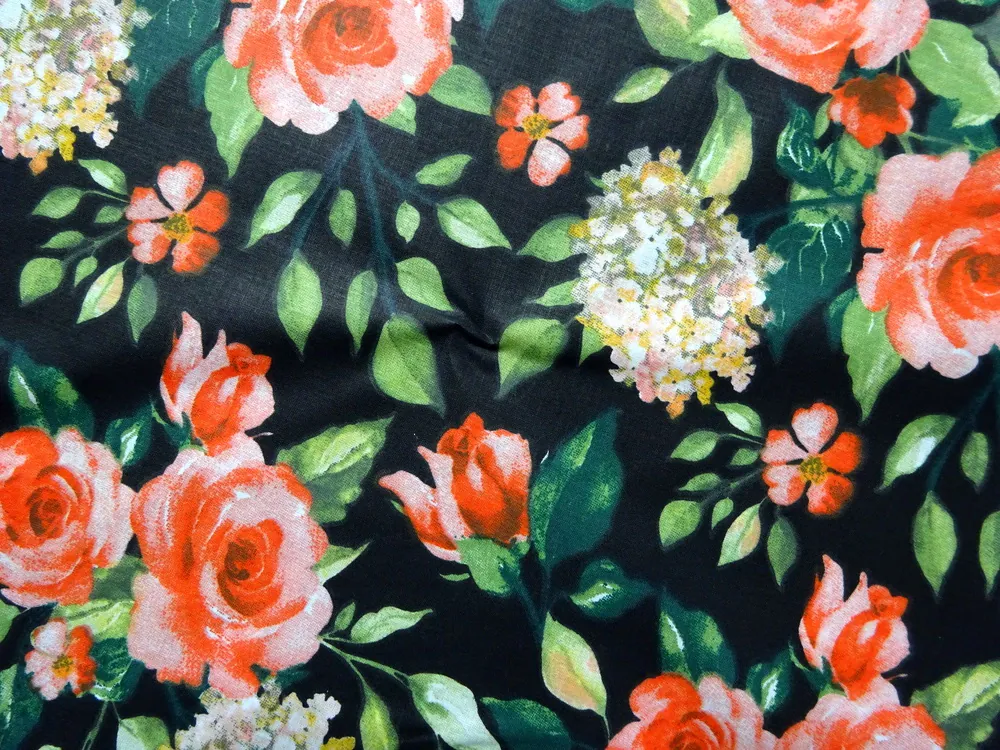 Bavlna čierna "kvety, listy"Skladom6,50 EUR/ m5,28 EUR bez DPH