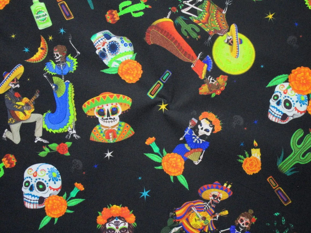 Bavlna čierna "tancujúci kostlivci" - ŠpanielskoSkladom7,00 EUR/ m5,69 EUR bez DPH