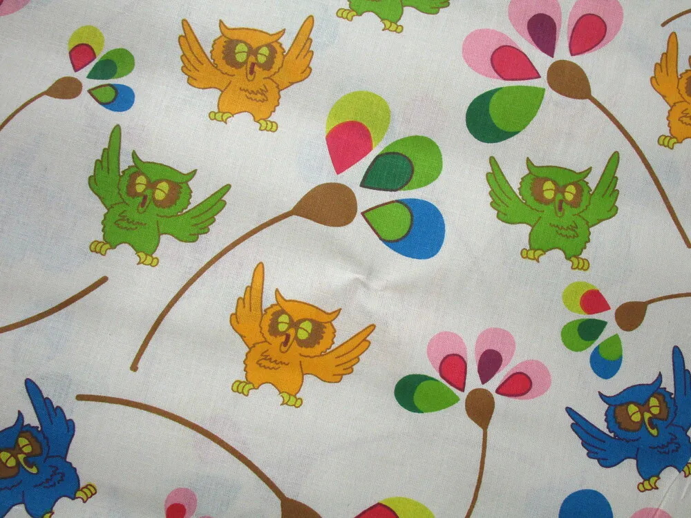 - vzor - pomarančové, zelené a modré sovičky, žlté, ružové, fialové, zelené a modré kvety