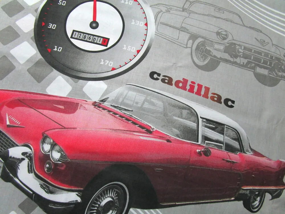 - vzor - tachometer, sivé auto, nápis "cadillac" a "vintage car", červený cadillac