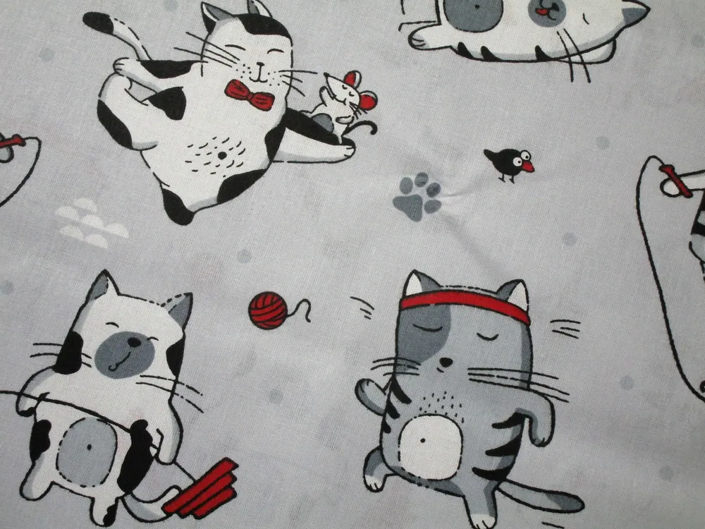 - vzor - bielo - sivo - čierne mačky, červené klbko, biele kopčeky, sivé ťapky