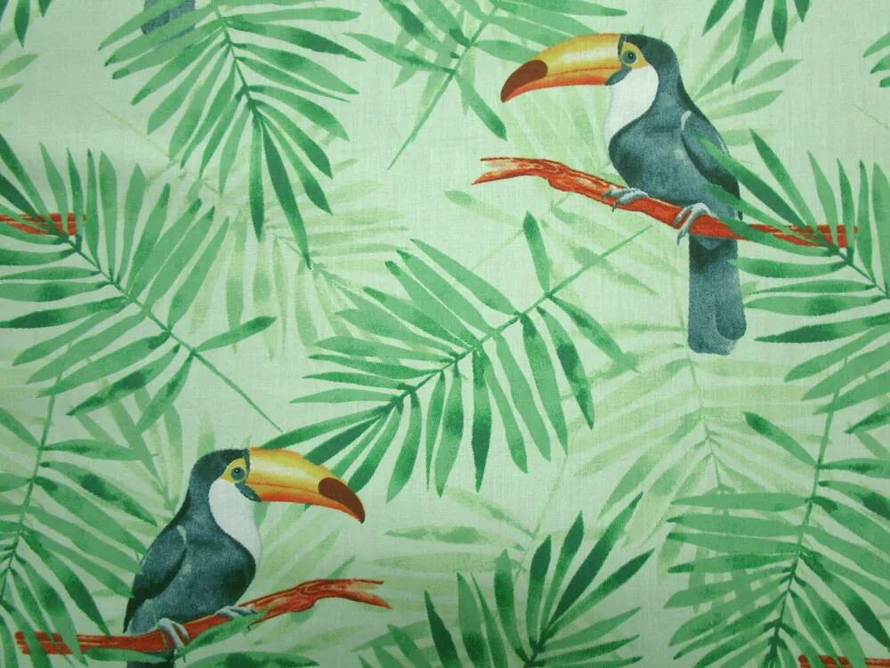 Bavlna zelená "tukan, listy"Skladom5,00 EUR/ m4,07 EUR bez DPH