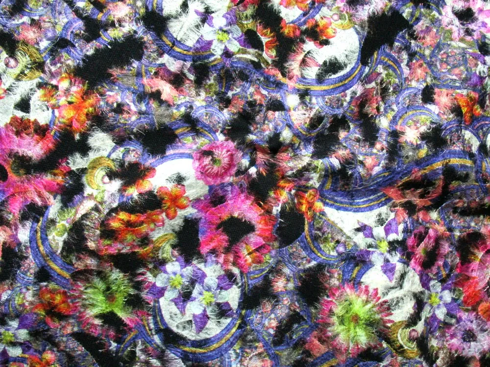 Kabátovina čierna "maslovo-ružovo-fialový vzor"Skladom20,00 EUR/ m16,26 EUR bez DPH