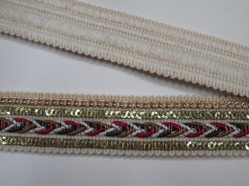 - vzor - bielo - horčicovo - červeno - hnedé šnúrky, zlaté flitre pod čiernou sieťkou