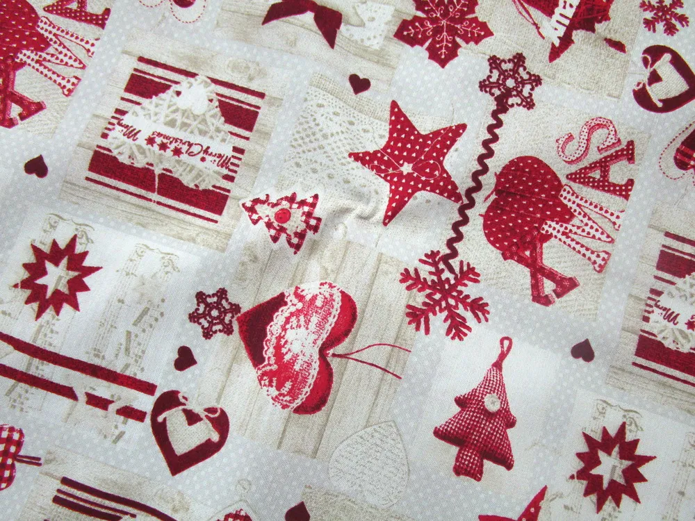 - vzor - červená vločka, červený nápis XMAS, červené srdiečko, červený stromček, béžové srdiečko, červený stromček