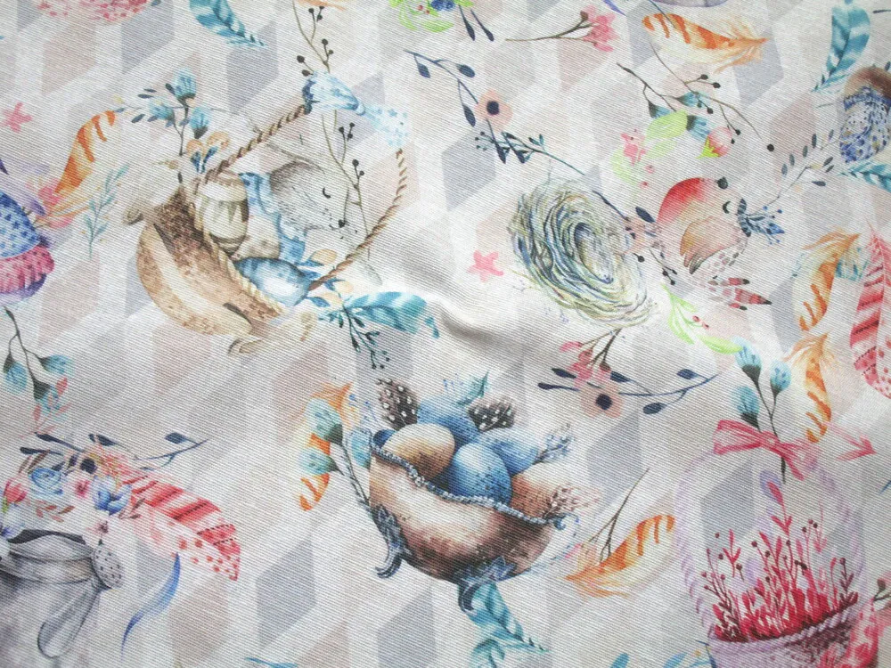 - vzor - béžovo-hnedé a modré vajíčka, zajko, farebné pierka, sivé a béžovo-púdrové piky na pozadí