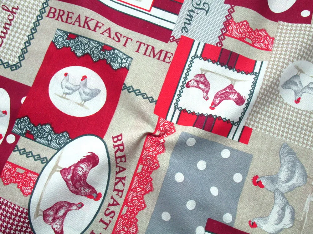 - vzor - nápisy "BREAKFAST TIME" a "Dinner Time", bodky, štvorce, bielo - sivé a bielo - vínové sliepky, rôzne ornamenty
