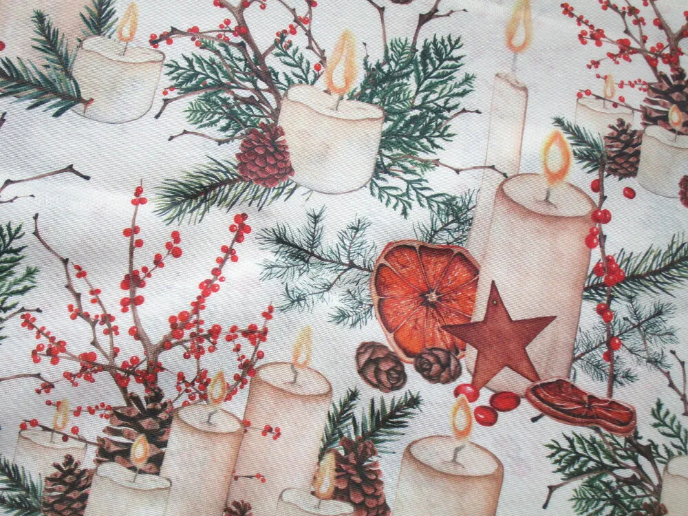 - vzor - béžové sviečky, hnedý domček, zelené ihličie, červené bobuľky, hnedé šišky, stromček, pomaranč