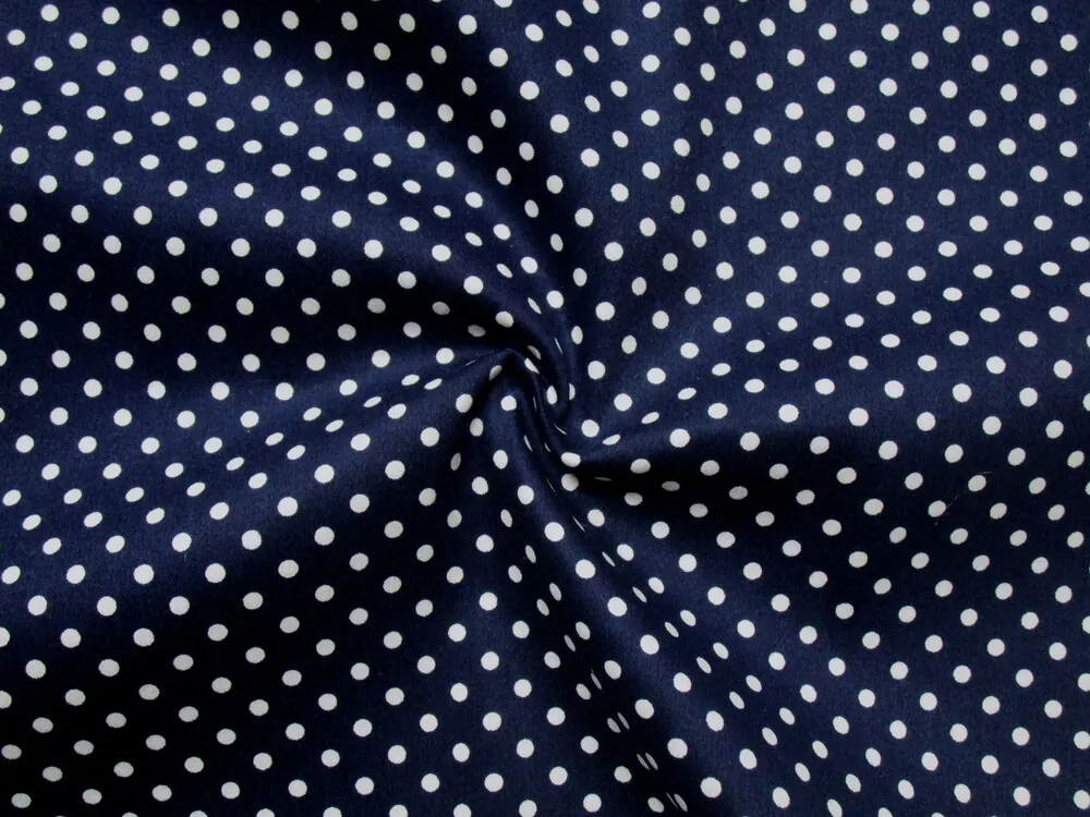 Satén bavlnený tmavomodrý "biela bodka"Skladom10,50 EUR/ m8,54 EUR bez DPH