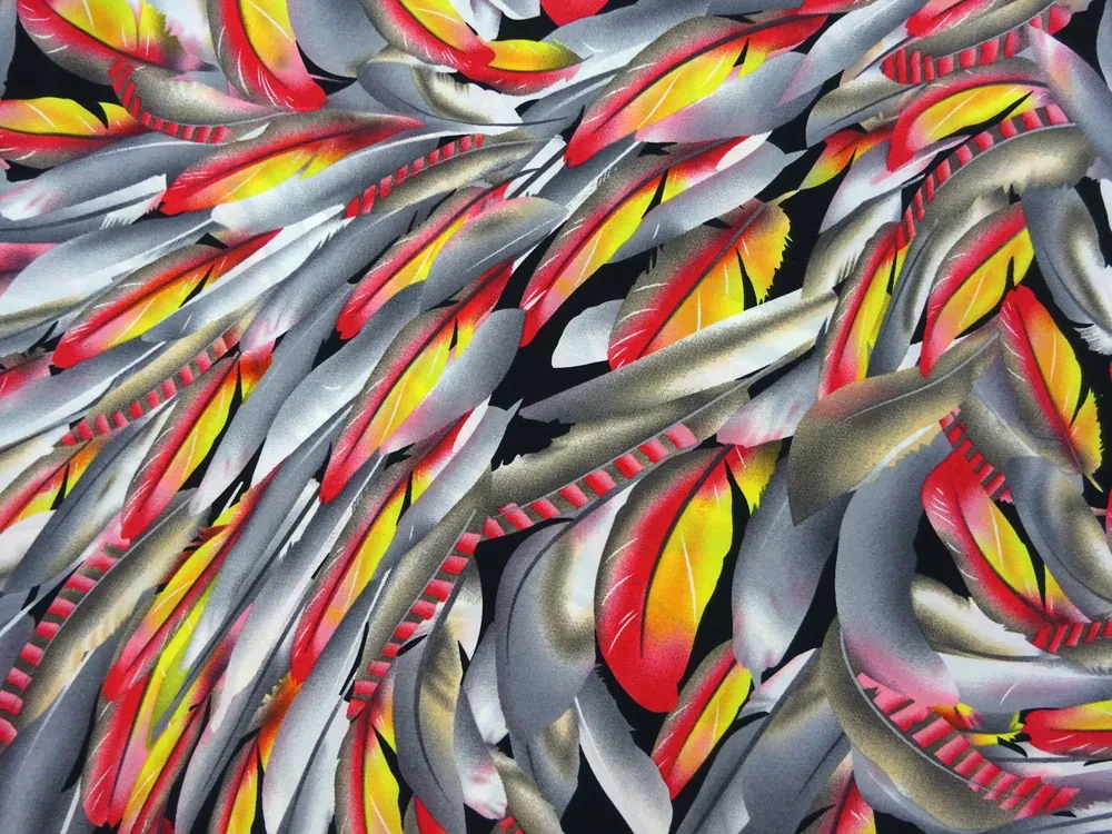 Šatovka čierna "žlto-červeno-sivé pierka"Skladom9,80 EUR/ m7,97 EUR bez DPH