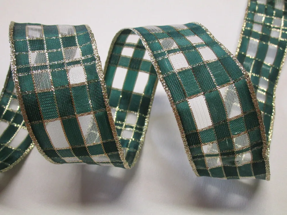 Stuha dekoračná s drôtikom "zeleno-zlaté káro" - 40 mm