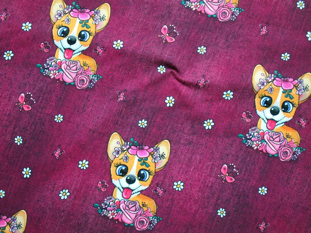 Teplákovina bordó denim "psík s kvetinami"Skladom14,50 EUR/ m11,79 EUR bez DPH