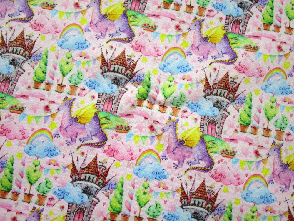 Teplákovina počesaná ružová "drak, zámok"Skladom12,50 EUR/ m10,16 EUR bez DPH