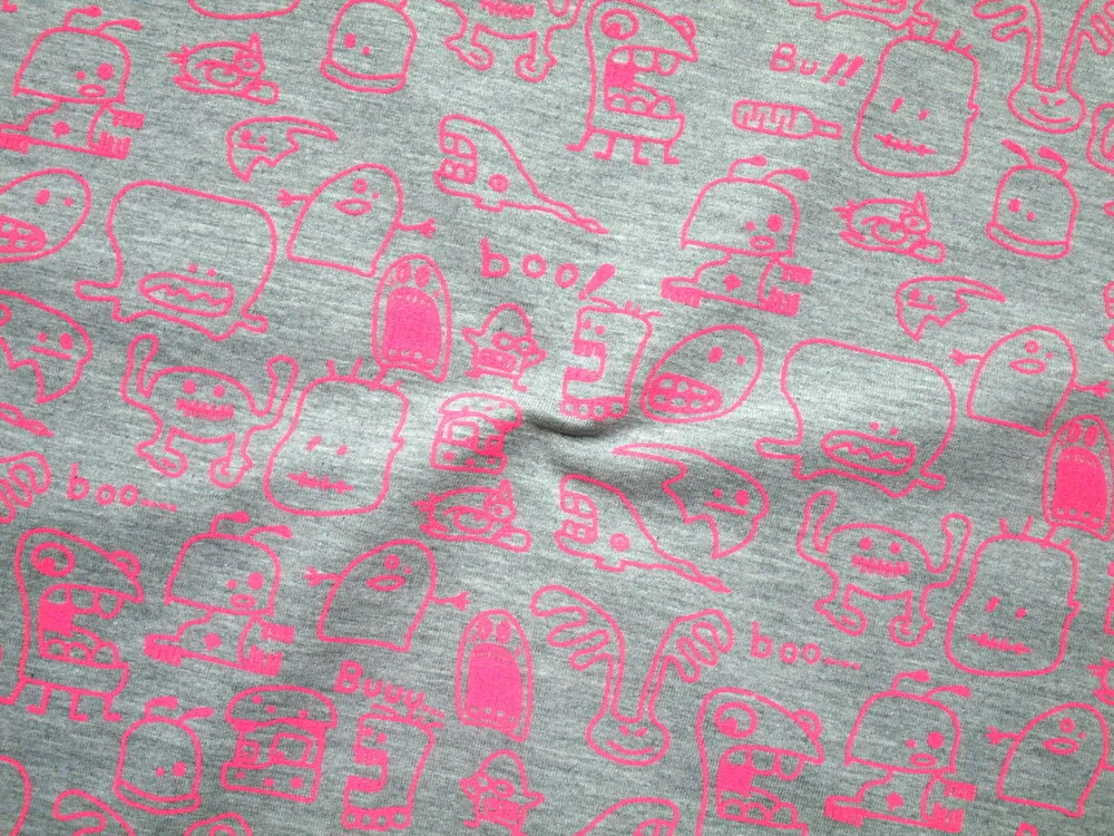 Teplákovina sivý melír "neónovo ružové postavičky"Skladom12,00 EUR/ m9,76 EUR bez DPH