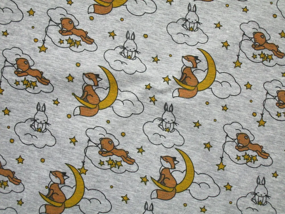 - vzor - béžovo - sivá líška, béžový macko, sivý zajačik, tmavožltý mesiac, oblaky, hviezdičky