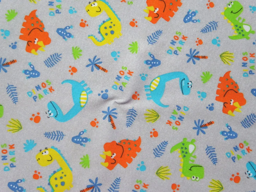 - vzor - žltý, pomarančový, zelený a tyrkysový dinosaurus, nápis "DINOS PARK", otlačky, listy