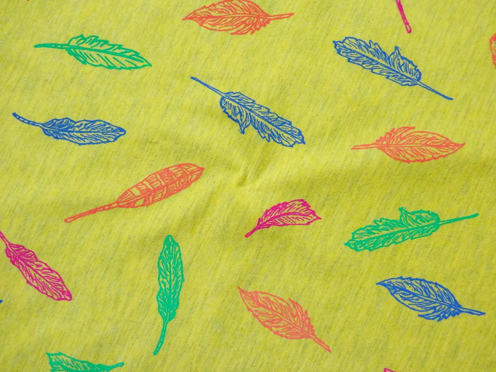 - vzor - pomarančové, zelené, vínové, modré pierko