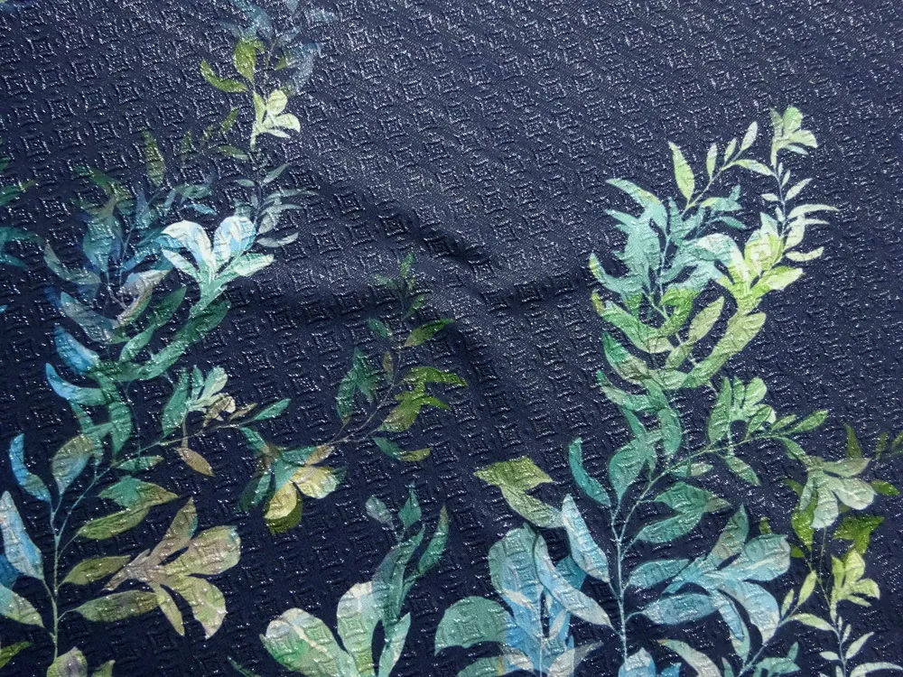 Žakard jemne plastický tmavomodrý "kvety, listy" - raport