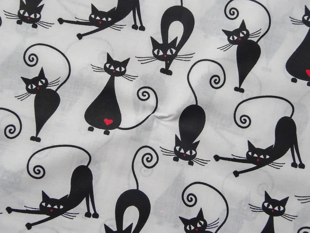 Bavlna biela "čierna mačička so srdiečkom"Skladom5,50 EUR/ m4,47 EUR bez DPH