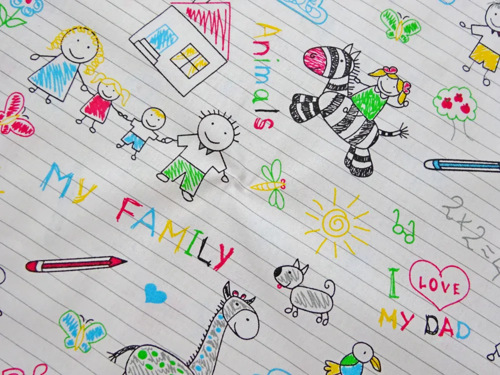 - vzor - rôzne obrázky, nápisy, sivé čiarky