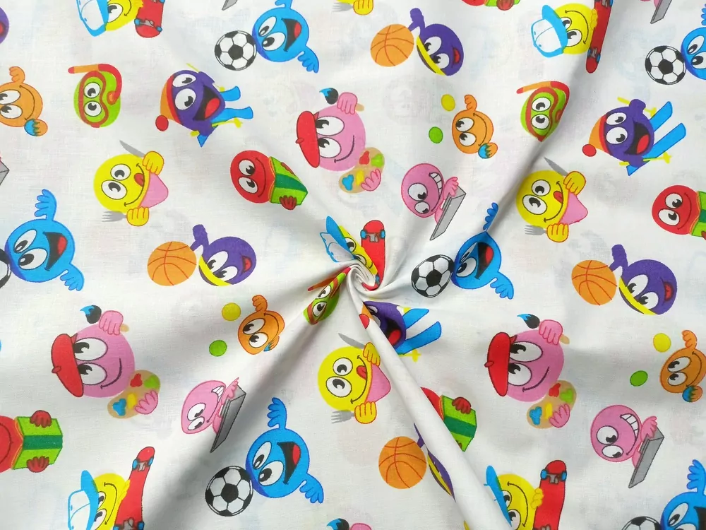 Bavlna biela "športujúci smajlíci"Skladom6,50 EUR/ m5,28 EUR bez DPH