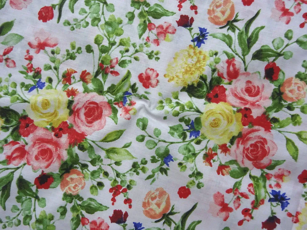 Bavlna biela "žlto-červená kytica kvetov"Skladom5,50 EUR/ m4,47 EUR bez DPH