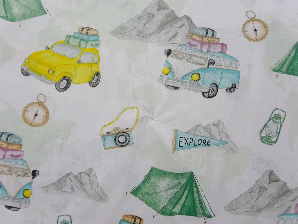 Bavlna bielo-zelenkavá "turistický motív"Skladom5,50 EUR/ m4,47 EUR bez DPH