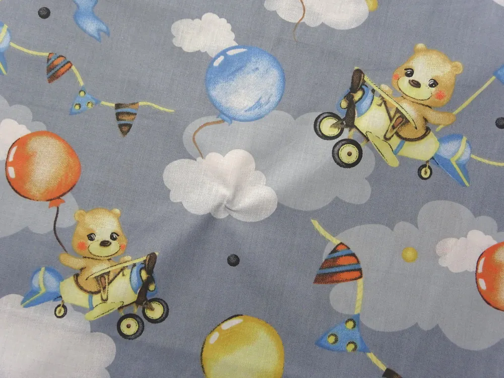 Bavlna sivá "macko v lietadle s balónikom"Skladom5,50 EUR/ m4,47 EUR bez DPH