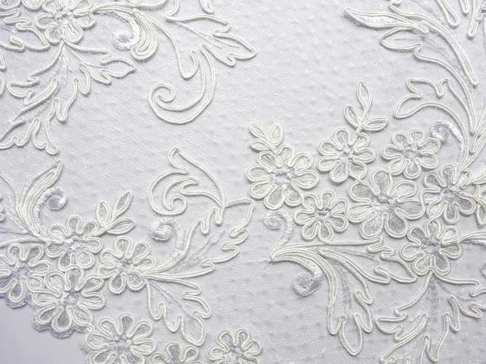 - vzor - biele vyšívané kvet, ivory šnúrka vytvárajúca plastické kvety a listy