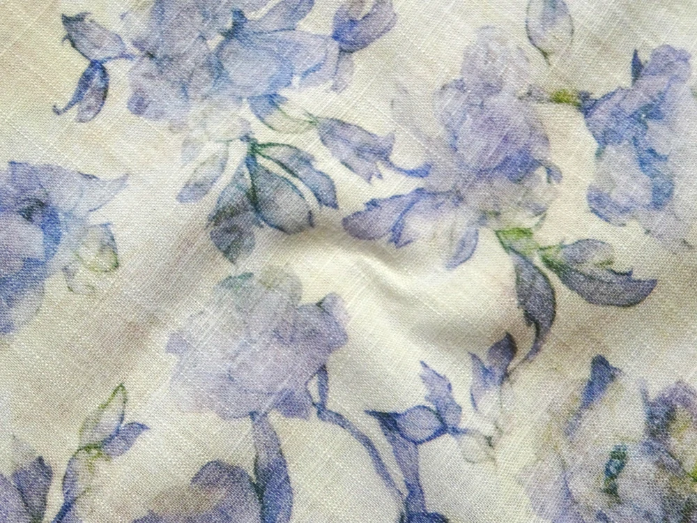 Ľan maslovo-béžová batika "modro-fialové kvety"Skladom19,50 EUR/ m15,85 EUR bez DPH