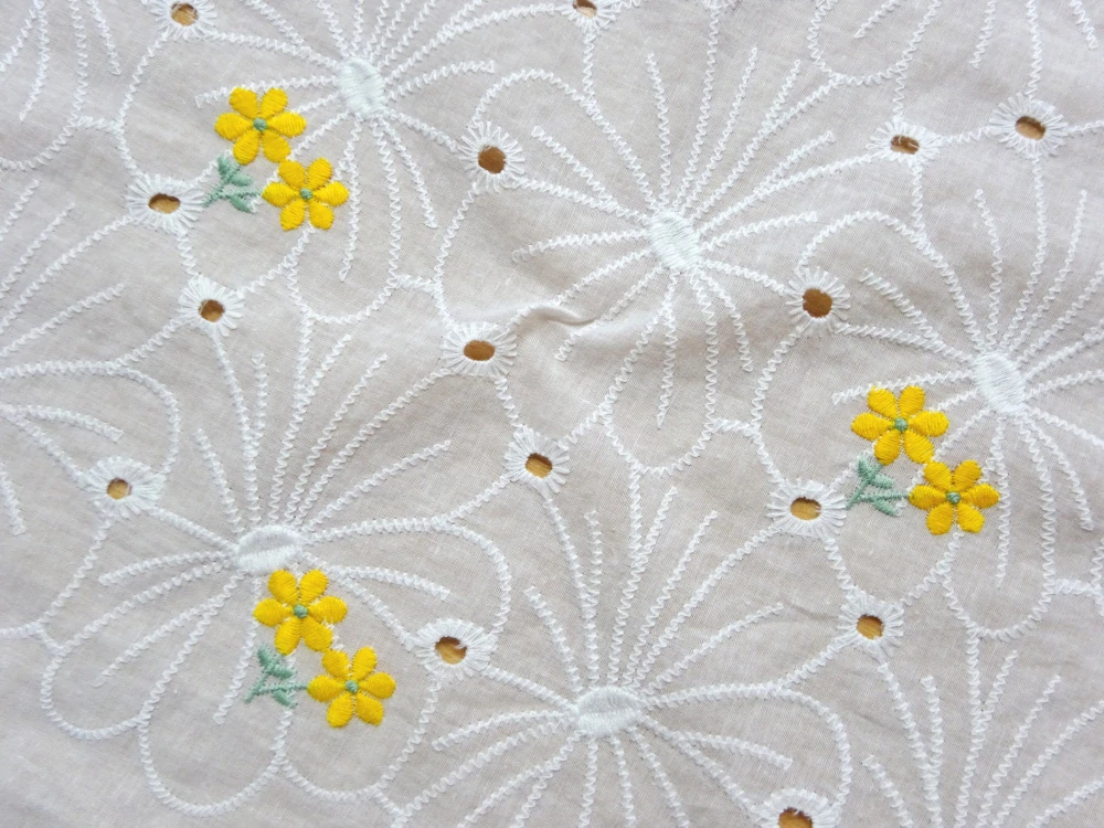 - vzor - biele veľké vyšívané kvety, žlté vyšívané kvety na zelenej stonke s lístkami