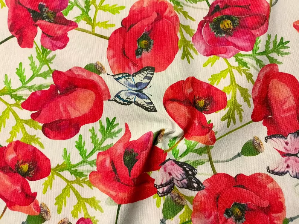 Poťahovka biela "červené maky, motýle"Skladom7,50 EUR/ m6,10 EUR bez DPH