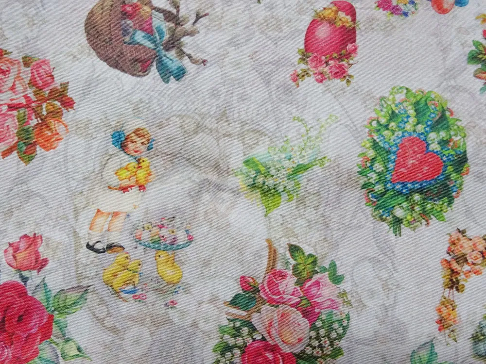 - vzor -béžovo-sivo-fialový ornament na pozadí, dievčatko s kuriatkami, kvety, košík s vajíčkami
