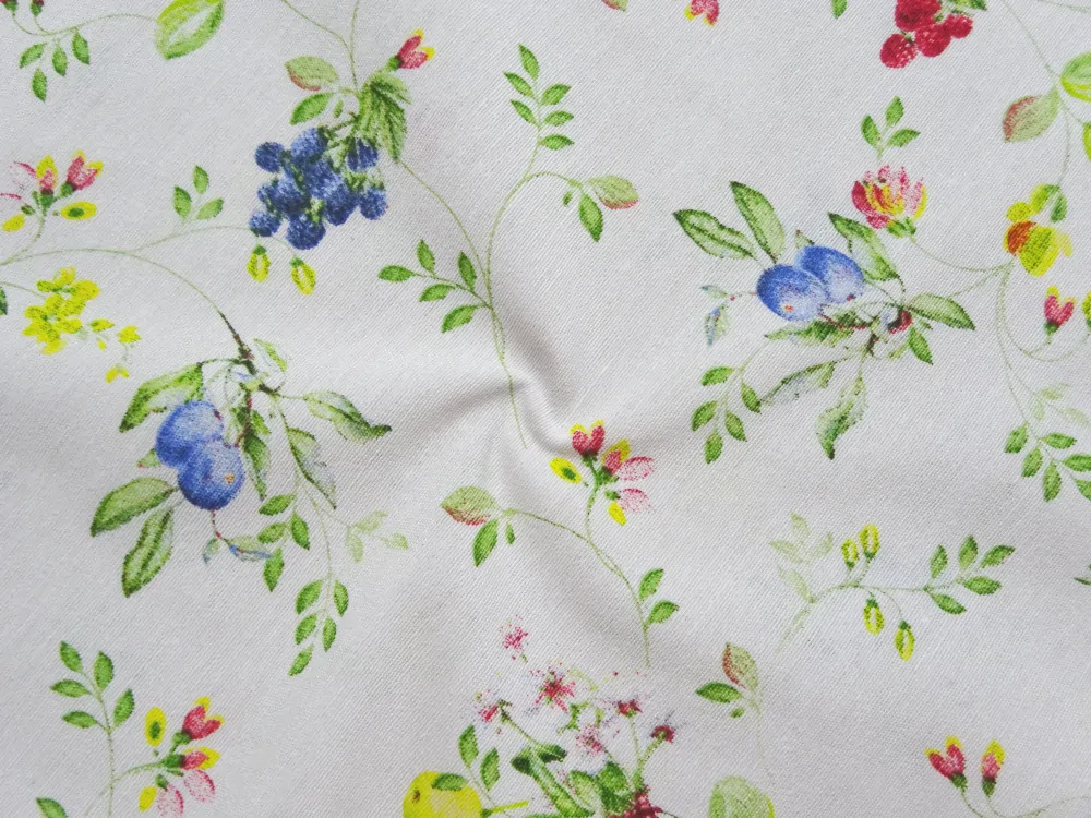 Poťahovka biela "ovocie, rastlinky"Skladom7,40 EUR/ m6,02 EUR bez DPH