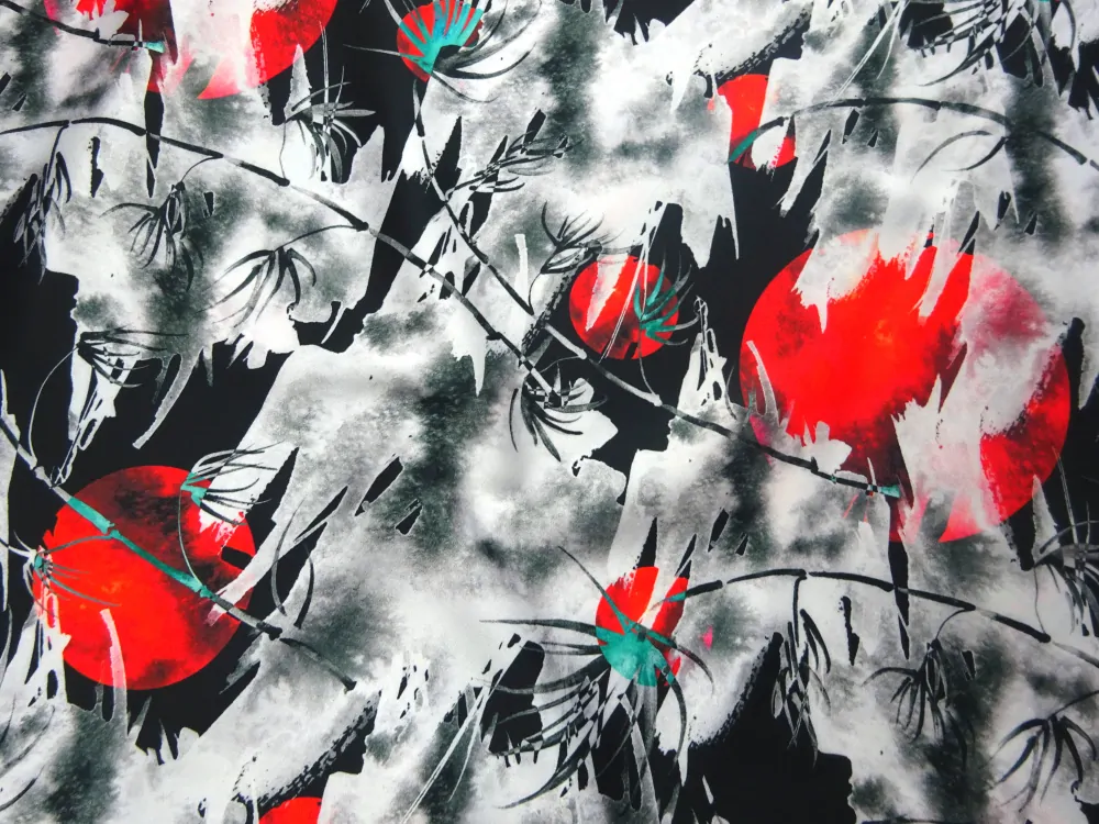 Satén Silky s hodvábom čierny "bielo-červený vzor"Skladom15,00 EUR/ m12,20 EUR bez DPH