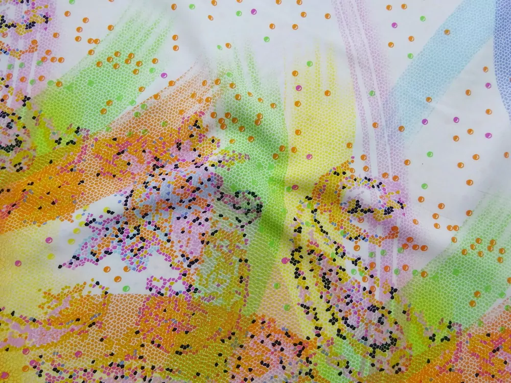 - okraje látky sú pomarančové, prechádza to do hustého vzoru, následne sa vzor zjemňuje a od stredu látky sa opäť zhusťuje