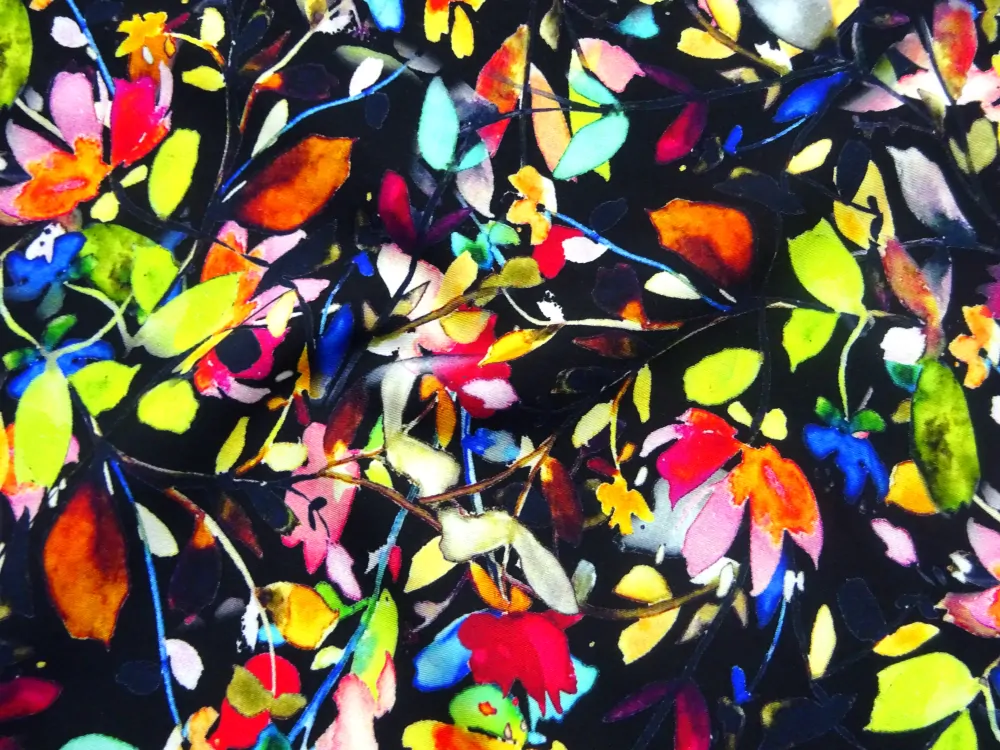 Šatovka čierna "farebné kvety, lístočky"Skladom13,00 EUR/ m10,57 EUR bez DPH