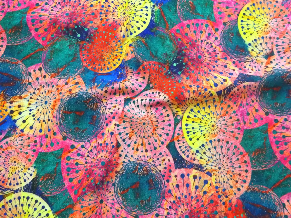 Šatovka s viskózou zelená "žlto-ružové vzorované kruhy"Skladom13,50 EUR/ m10,98 EUR bez DPH