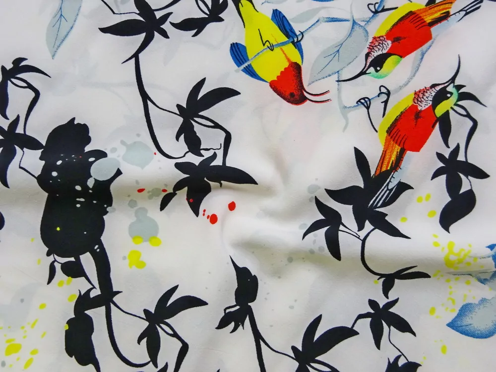 - vzor - farebné vtáky, čierne a modré konáre a listy, červený drobný chrústici na modrom liste, červené/žlté a sivé škvrny