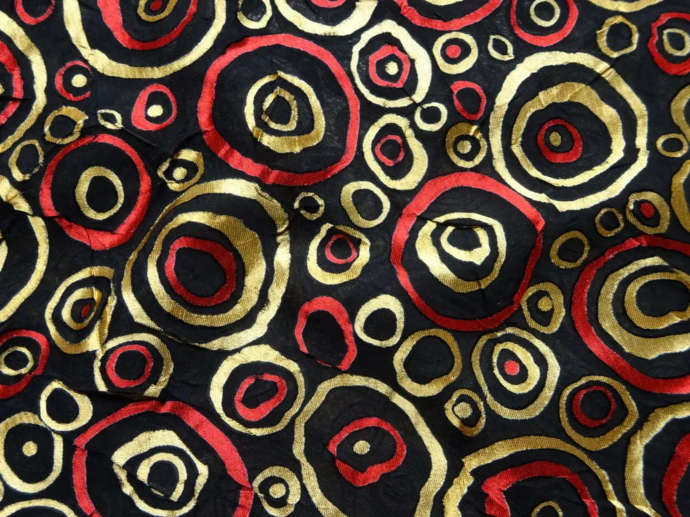 Šifón čierny "zlatý a červený kruh"Skladom7,20 EUR/ m5,85 EUR bez DPH