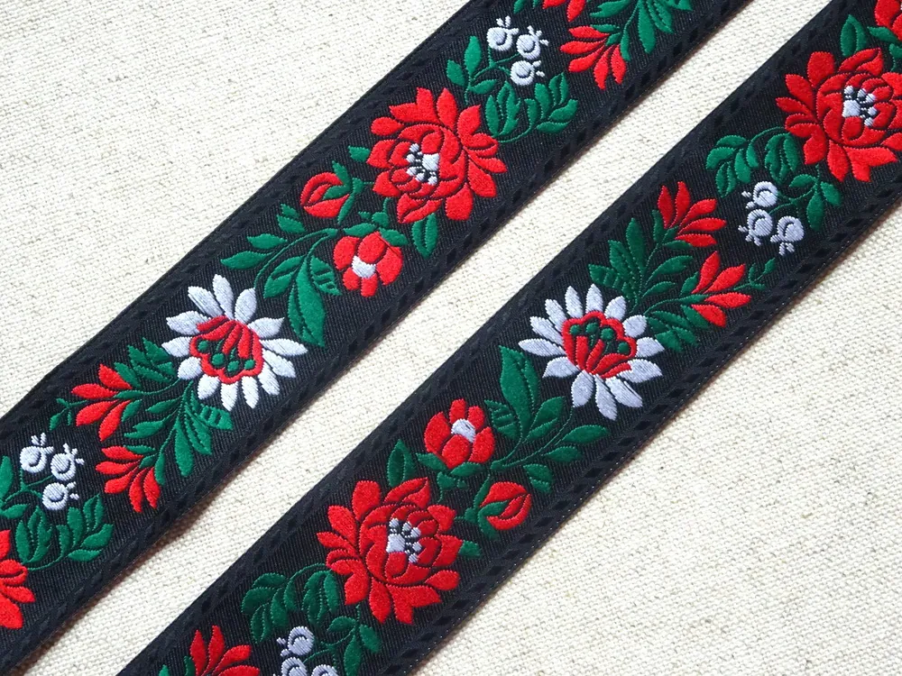 - Stuha krojová čierna "biely a červený kvet" - 3,5 cm